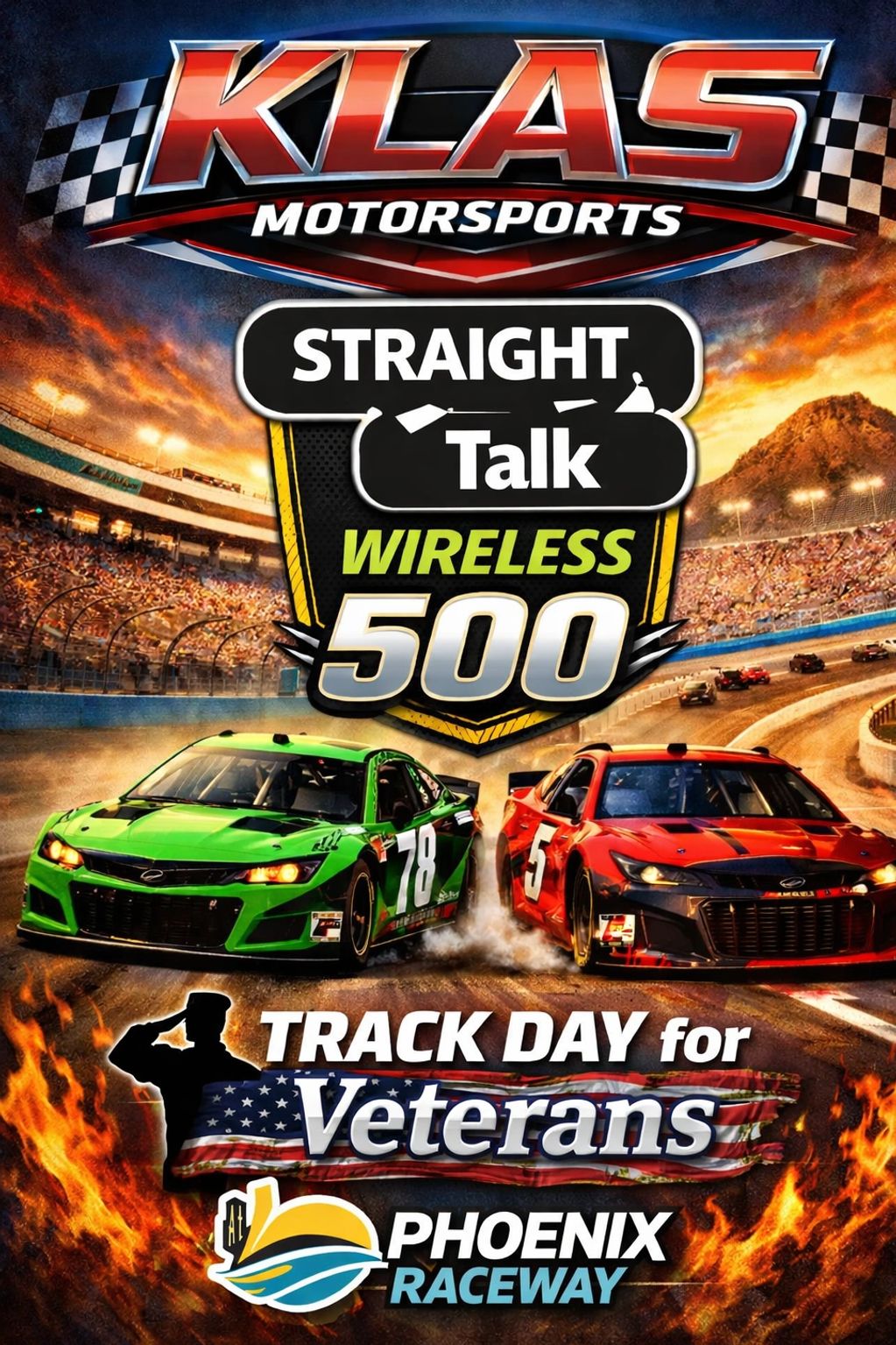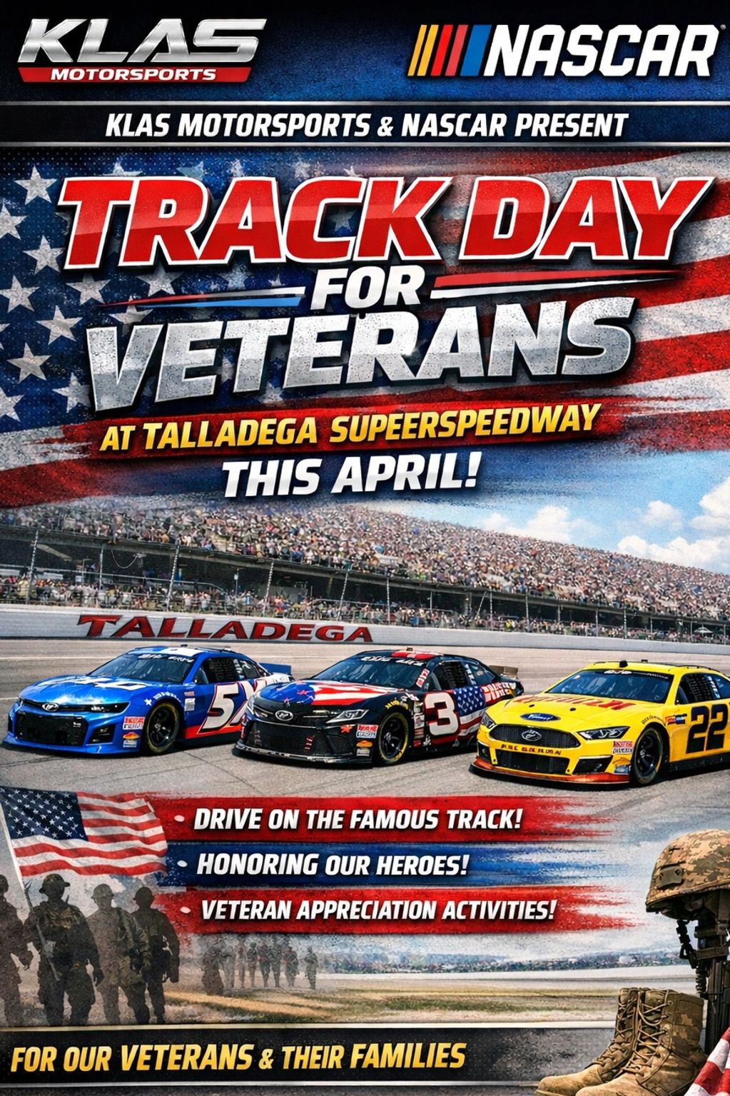KLAS Motorsports, in partnership with Talladega Superspeedway, is proud to host Track Day for Veterans—an unforgettable VIP experience created to honor Veterans from all eras of service.